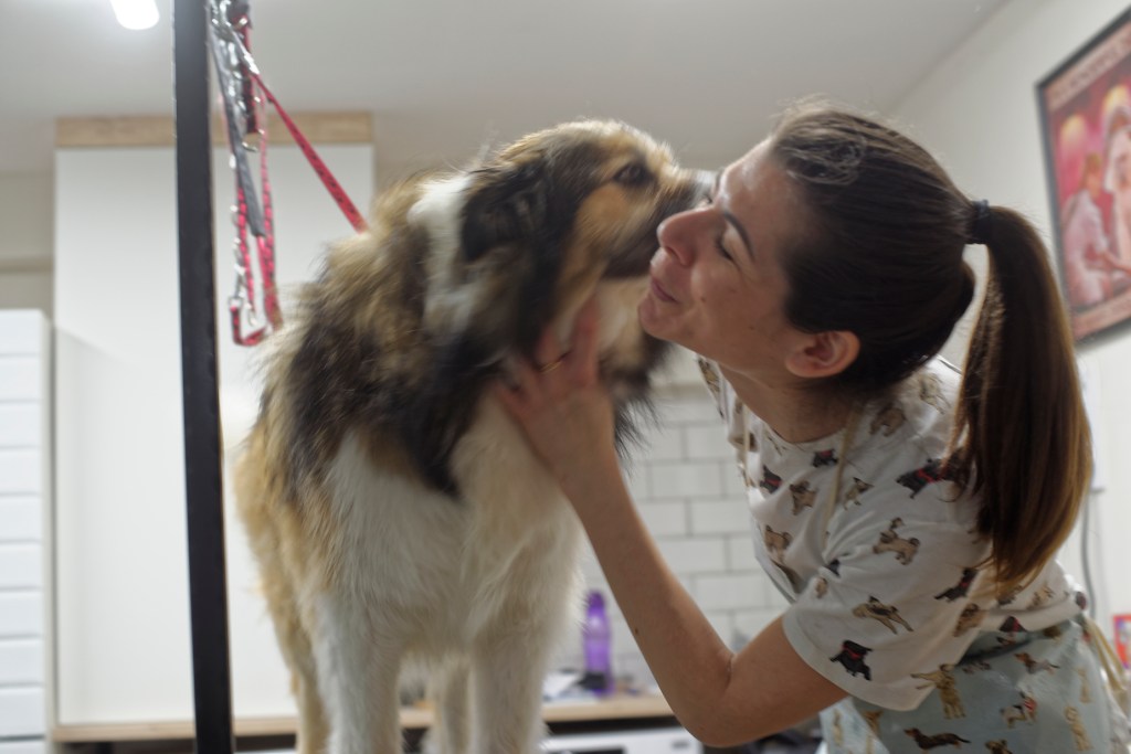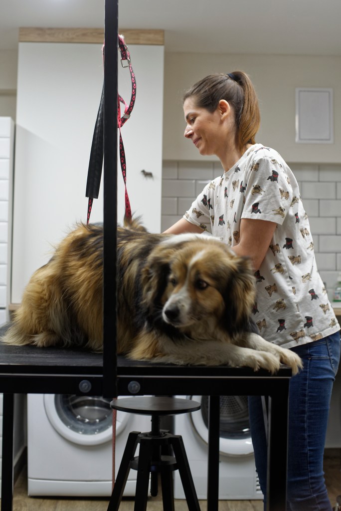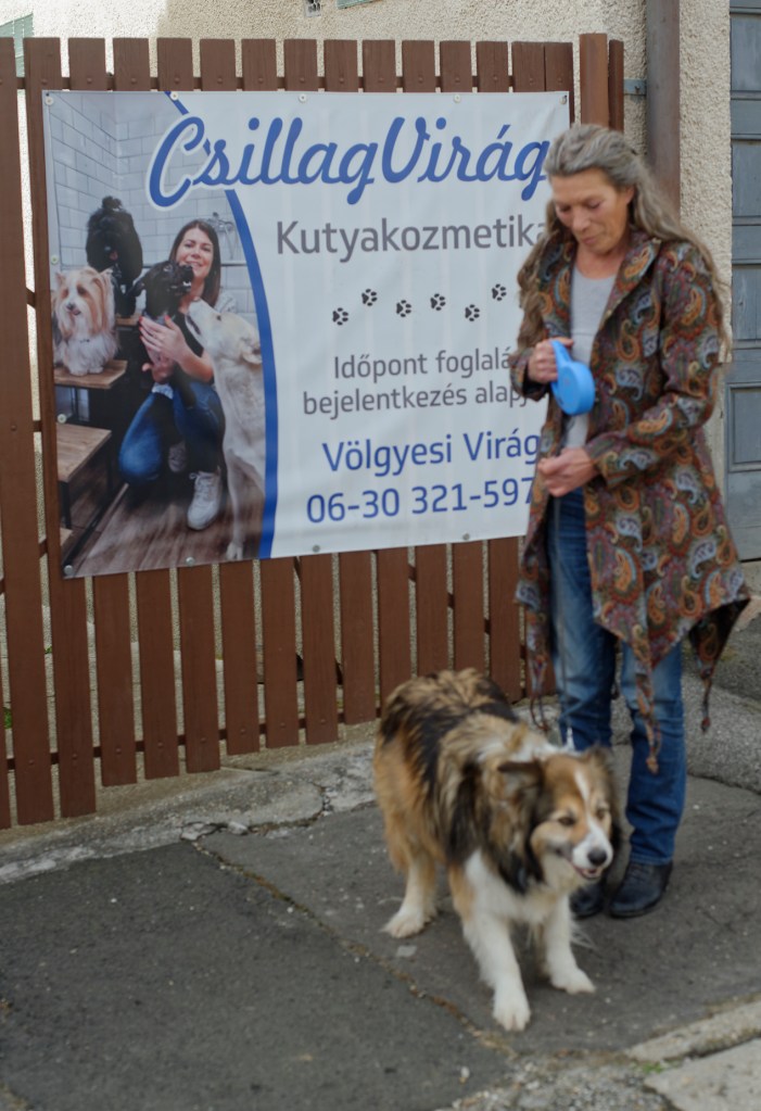 Iets meer dan een jaar geleden is Virág haar eigen salon gestart en, naar wat ik op de prijslijst zag, het meest in hele kleine soorten. Dus minder vies, minder haar en minder klitten. Hij werd een soort gezekerd op die tafel, zodat hij op zijn plaats bleef en er niet vandoor kon gaan toen hij die borstel zag. Ze sprak lief tegen hem en daar is hij nou juist heel erg gevoelig voor. De overgave kwam niet meteen, dat zeker niet, maar wel na enige tijd. Ze lichtte zijn staart op en vroeg of ze het haar daaronder, wat ooit eens hele mooie flanken waren, moest kammen of knippen. Nou, ik ken die achterkant van hem en die bewerk ik ook met een schaar, alleen wel wat minder professioneel, dat geef ik toe. Daarom kwam de schaar er aan te pas.