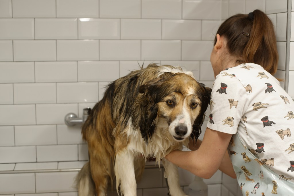 Eenmaal in bad werd hij ook weer gezekerd. Een vrouw met ervaring, want anders was hij toch echt gevlucht. Maar dat kon niet meer, dat vluchten. We zagen het zand en de blubber met het water zijn jas uit spoelen. Nog even lekker inzepen voor de algehele wasbeurt, inclusief massage. Daarna weer uitspoelen en zowel de vloer als plafond als Virág zelf dropen van het water. Bij kleine hondjes heeft ze daar toch iets minder last van.