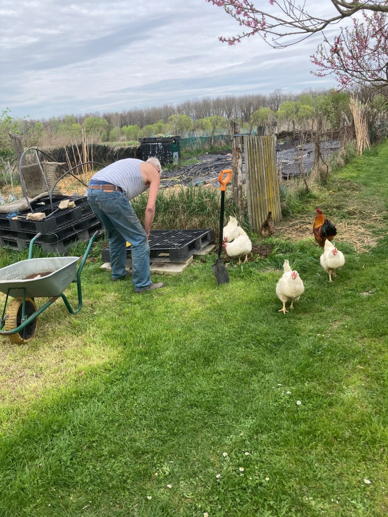 Nu hebben wij geen hazen, zelfs geen konijnen. Maar we hebben wel kippen. Zeven stuks. Vijf grote witte kippendames (die ook wel Duits lijken vanwege de diepe kuilen die ze graven voor hun wel verdiende zandbadje), één halve zijdehoen en één mix van kriel/zijdehoen. Een bont gezelschap dus. En natuurlijk 2 hanen. Maar die leggen geen eieren, die zorgen alleen voor het nageslacht en ik moet zeggen dat ze daar een dagtaak aan hebben. Of het moet zijn dat ze Hans helpen in de tuin, terwijl hij iets aan het uitgraven is. Toffe helpers zijn het.