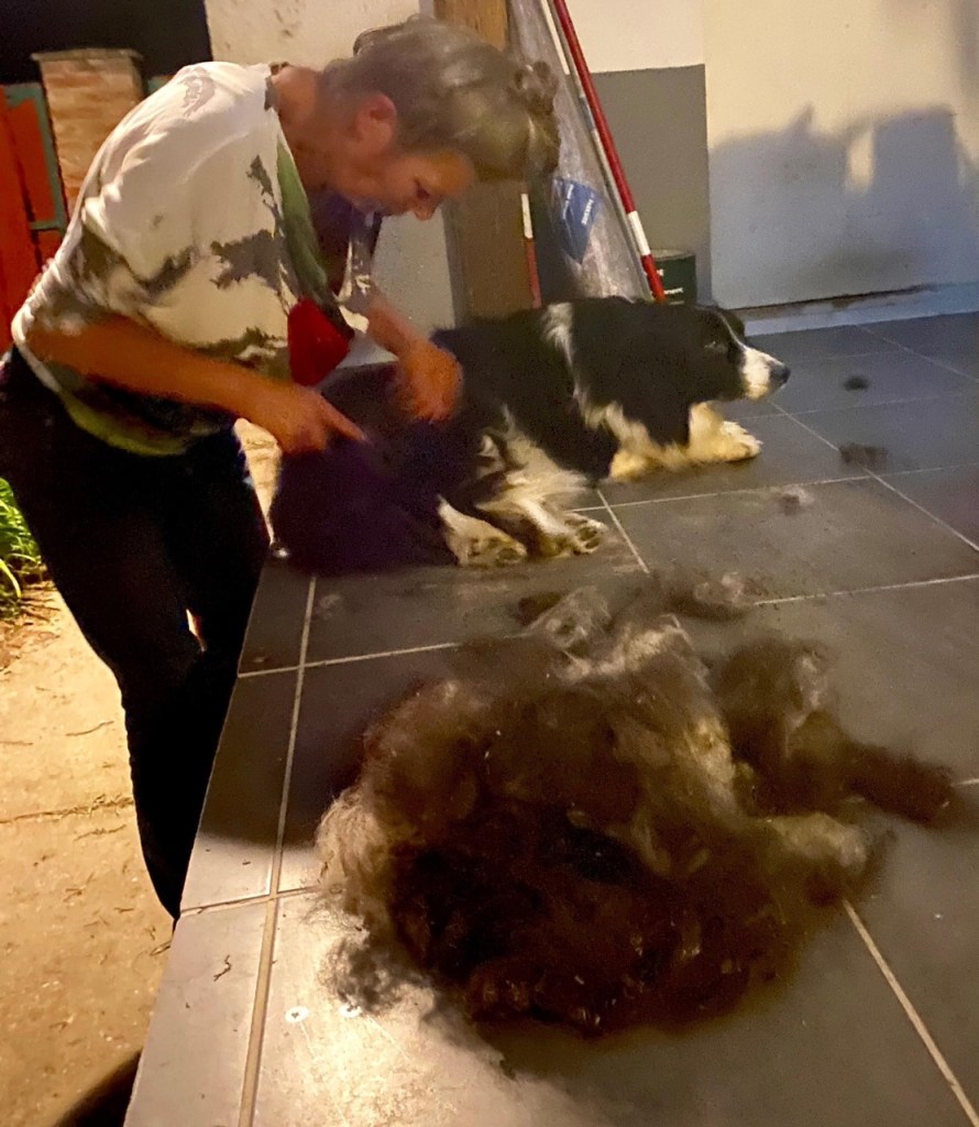 Op de voorgrond geen andere hond, maar het uitgekamde haar, inclusief alle distels, van meneer Brigi..